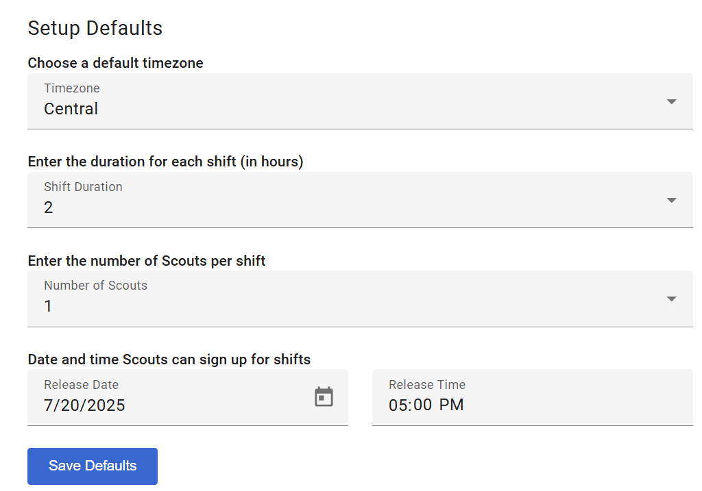 - Date and time Scouts can sign up for shifts