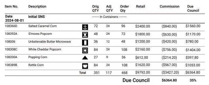 For each product on the order, you will see the retail value of the product ordered, the commission that your unit gets for the product, and the amount due to council for the product ordered.