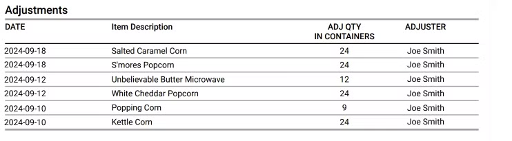 All popcorn orders will display on the invoice. Orders will include the date of the order and the order name. It will show the original amount of each product that was ordered, the total of any adjustments made to that product, and the final amount on the order. The final amount is labelled as Order Qty and takes into account the original order and adjustments.
