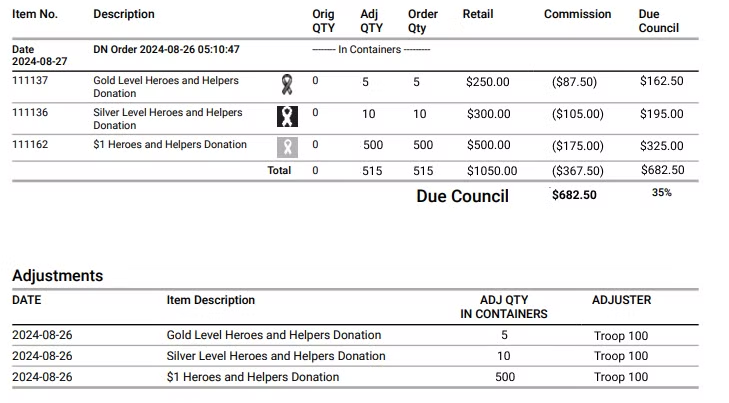 - Generate Invoice with Adjustments - This invoice will show all orders that have been placed by the unit and transactions that have applied to the amount due to council. It will also include details about all adjustments made to the orders. Adjustment details include the date of each adjustment, how much was adjusted on that date, and who made the adjustment.