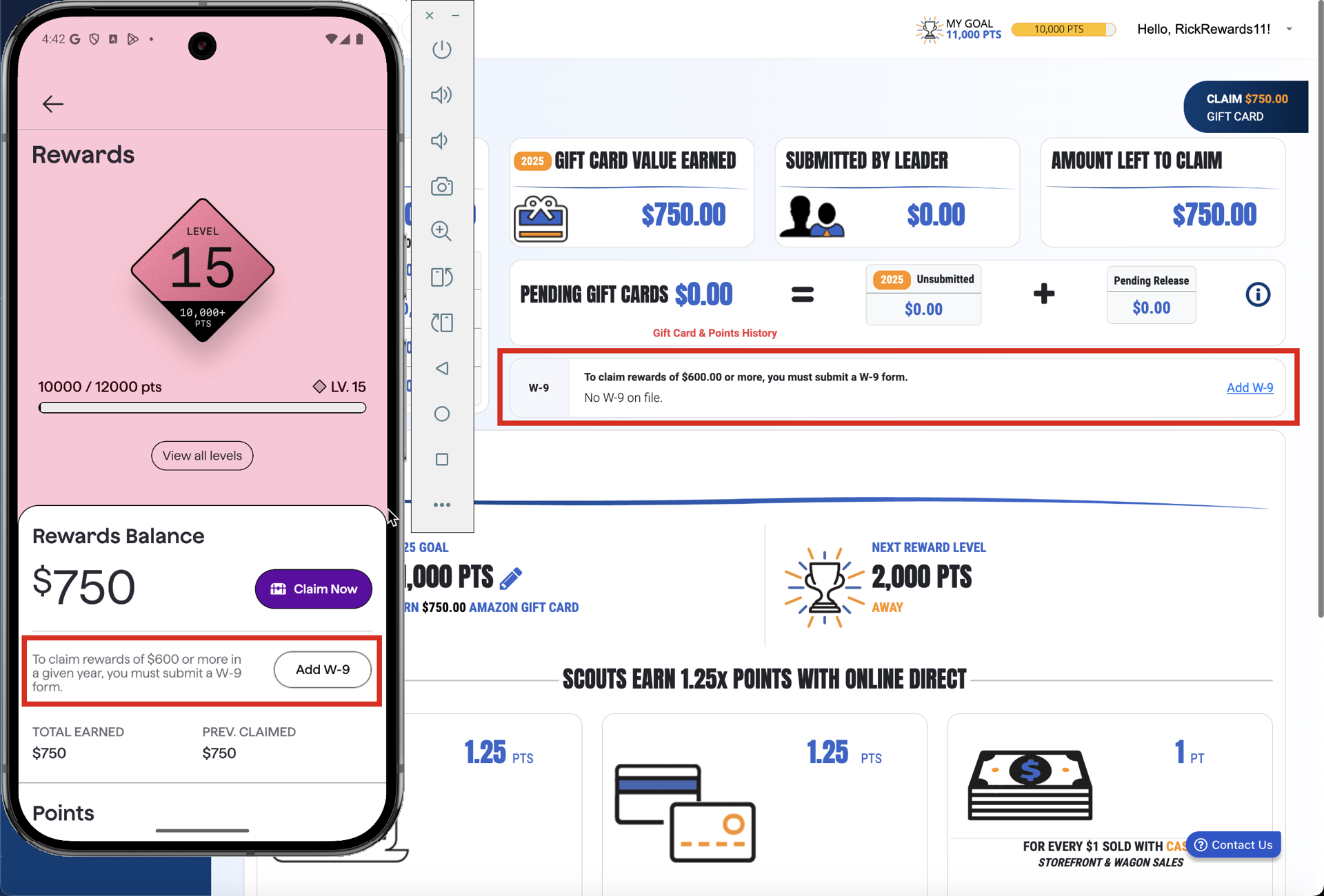 The federal government requires Trail's End to issue a 1099-MISC to anyone receiving over $600 in gift cards within a calendar year. If applicable, the Scout will be prompted to enter a W-9 prior to claiming rewards. Note that the $600 is per calendar year, so if rewards from the previous year were claimed in the current year, that will impact whether a W-9 is required.
